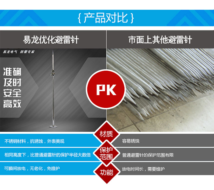 EPE系列提前放電避雷針(以下簡(jiǎn)稱EPE避雷針)采用法國(guó)技術(shù),符合法國(guó)NFC17-102標(biāo)準(zhǔn)。它由三種系統(tǒng)(大氣電力電容器、高壓脈沖發(fā)送系統(tǒng)、電流泄放系統(tǒng))組成,具有雙重瞬間放電裝置,被多層的具有隔絕惡劣環(huán)境及水密性的材料所保護(hù);無老化危險(xiǎn),免維護(hù)。在相同的安裝高度下,比普通瞬間避雷針的保護(hù)半徑大數(shù)倍,搶先放電時(shí)間為30μs~60μs,即優(yōu)先引雷入地。