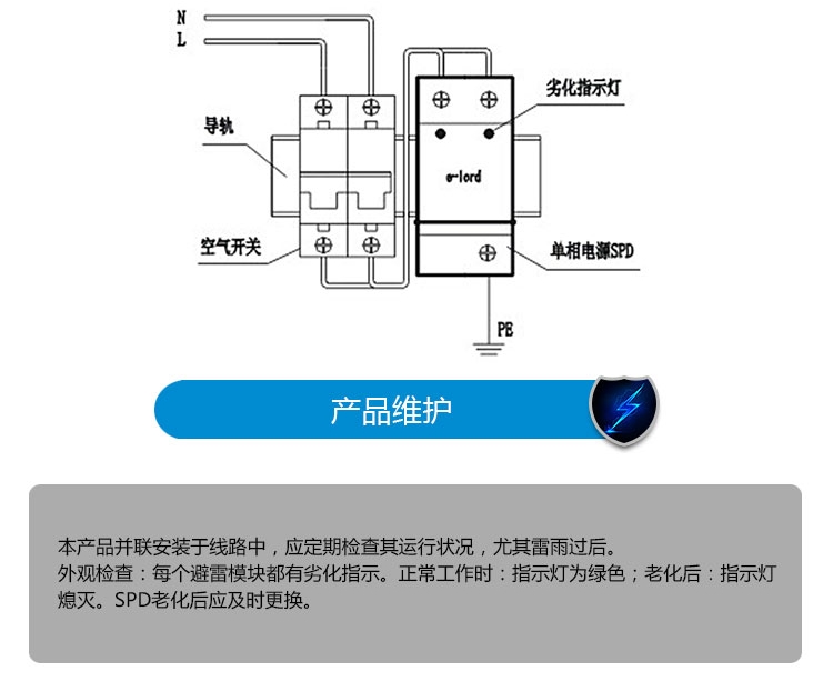 1. 已有可靠接地系統(tǒng),在配電柜(避雷器安裝處)的接地樁 (條)上進(jìn)行接地電阻的測定,電阻應(yīng)符合相關(guān)規(guī)范要求。 (或滿足國家、部級標(biāo)準(zhǔn))。 2. 配電柜中應(yīng)留有安裝避雷器的空間, 注:L為電源相線;N為電源零線;PE為地線。 | 應(yīng)檢查空氣開關(guān)已經(jīng)合閘導(dǎo)通,以保證避雷器處于運(yùn)行狀態(tài); 不要在雷雨天安裝。 |