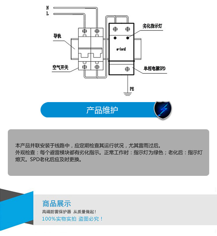 1. 已有可靠接地系統(tǒng),在配電柜(避雷器安裝處)的接地樁 (條)上進(jìn)行接地電阻的測(cè)定,電阻應(yīng)符合相關(guān)規(guī)范要求。 (或滿足國(guó)家、部級(jí)標(biāo)準(zhǔn))。 2. 配電柜中應(yīng)留有安裝避雷器的空間, 注:L為電源相線;N為電源零線;PE為地線。 | 應(yīng)檢查空氣開關(guān)已經(jīng)合閘導(dǎo)通,以保證避雷器處于運(yùn)行狀態(tài); 不要在雷雨天安裝。 |