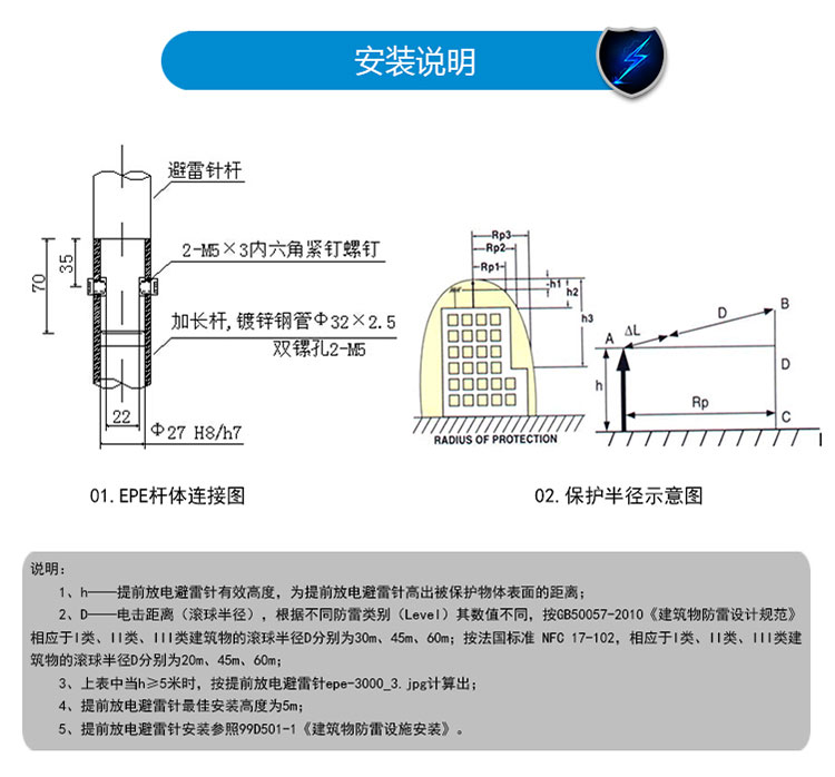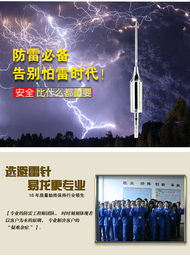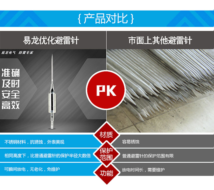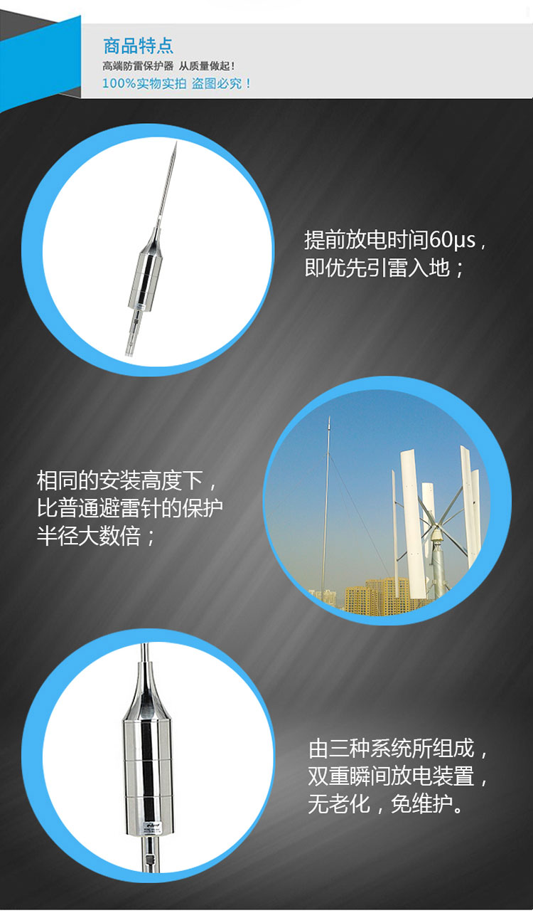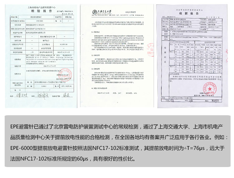 EPE系列提前放電避雷針(以下簡(jiǎn)稱EPE避雷針)采用法國(guó)技術(shù),符合法國(guó)NFC17-102標(biāo)準(zhǔn)。它由三種系統(tǒng)(大氣電力電容器、高壓脈沖發(fā)送系統(tǒng)、電流泄放系統(tǒng))組成,具有雙重瞬間放電裝置,被多層的具有隔絕惡劣環(huán)境及水密性的材料所保護(hù);無老化危險(xiǎn),免維護(hù)。在相同的安裝高度下,比普通瞬間避雷針的保護(hù)半徑大數(shù)倍,搶先放電時(shí)間為30μs~60μs,即優(yōu)先引雷入地。